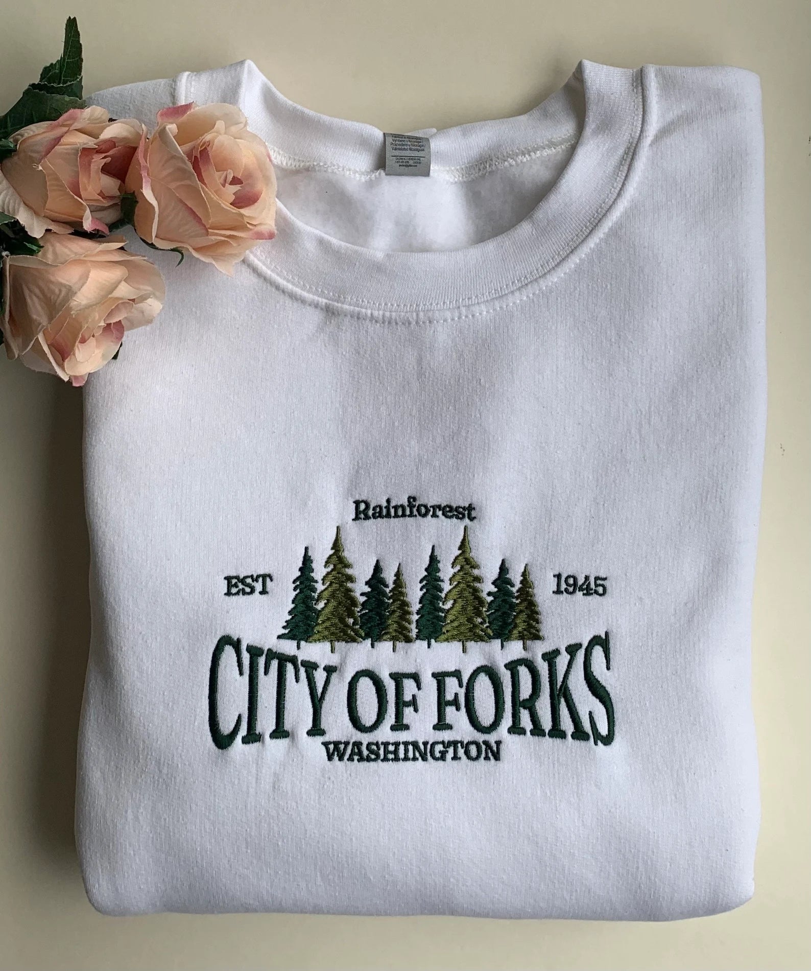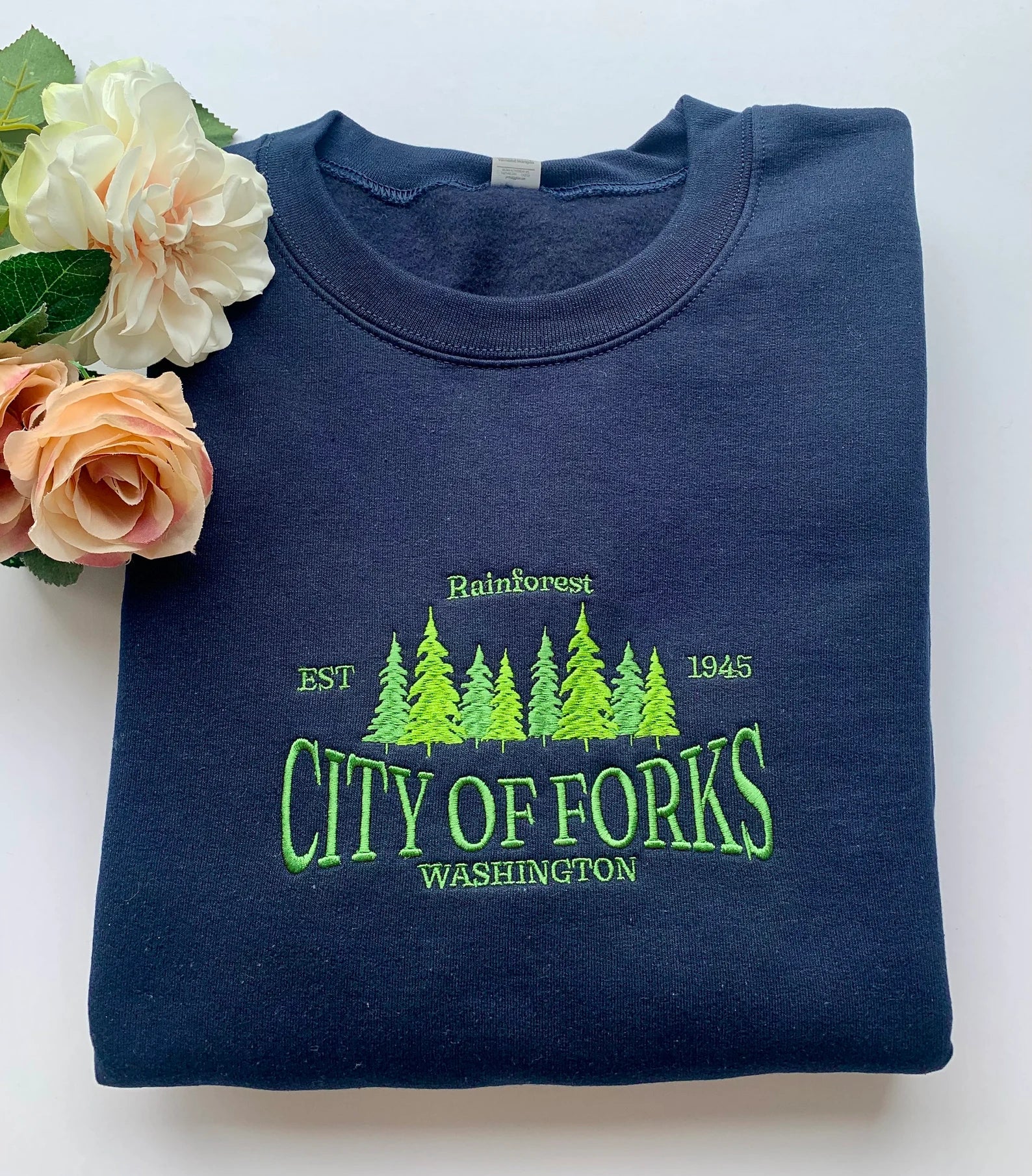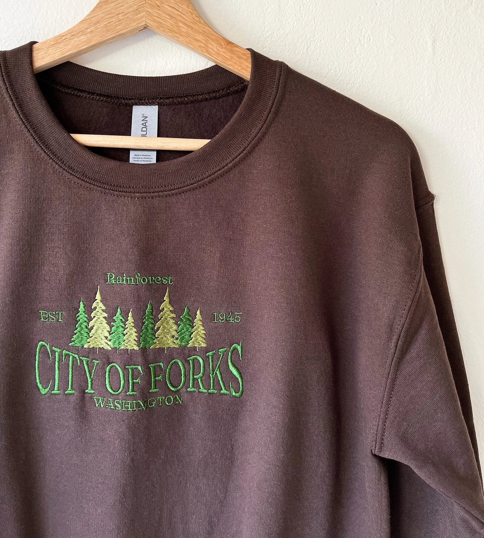 The iconic Forks, Washington embroidered sweater - message for custom thread colours
