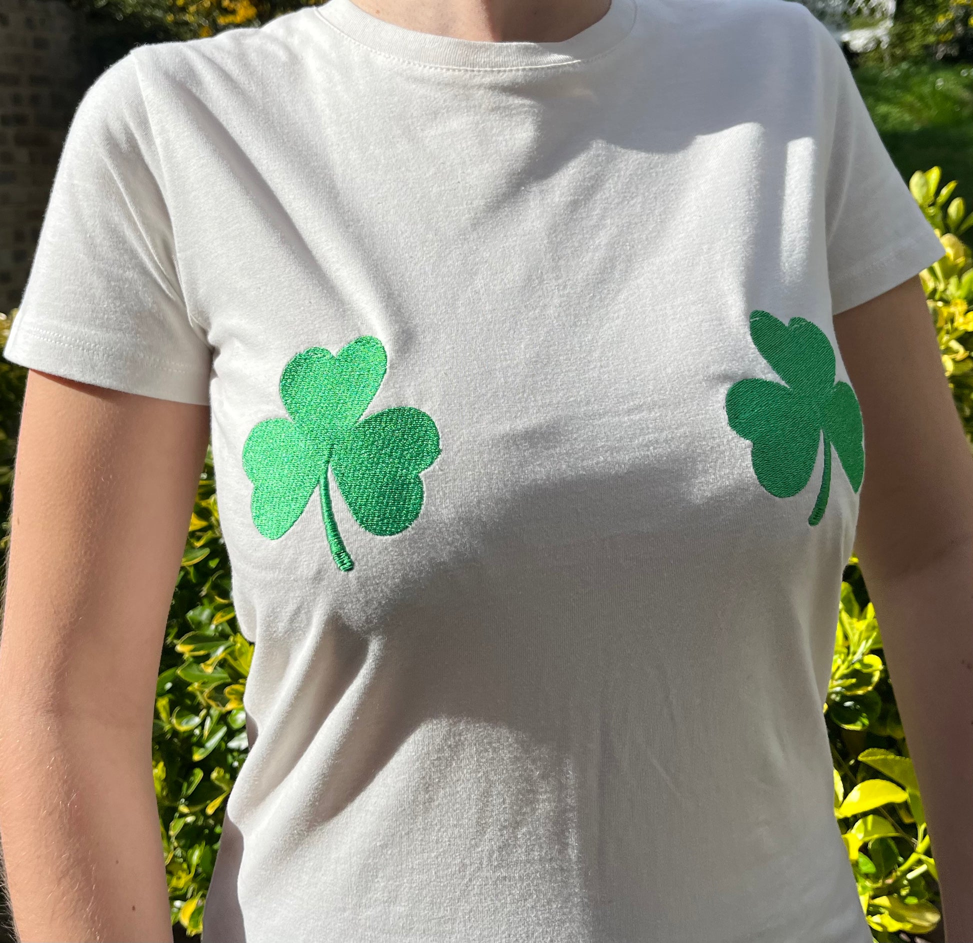 Slight imperfection/ gap in threading on shamrocks, please see photos. Model (Size UK 12) wears Size Medium in a Women's Fitted Tee